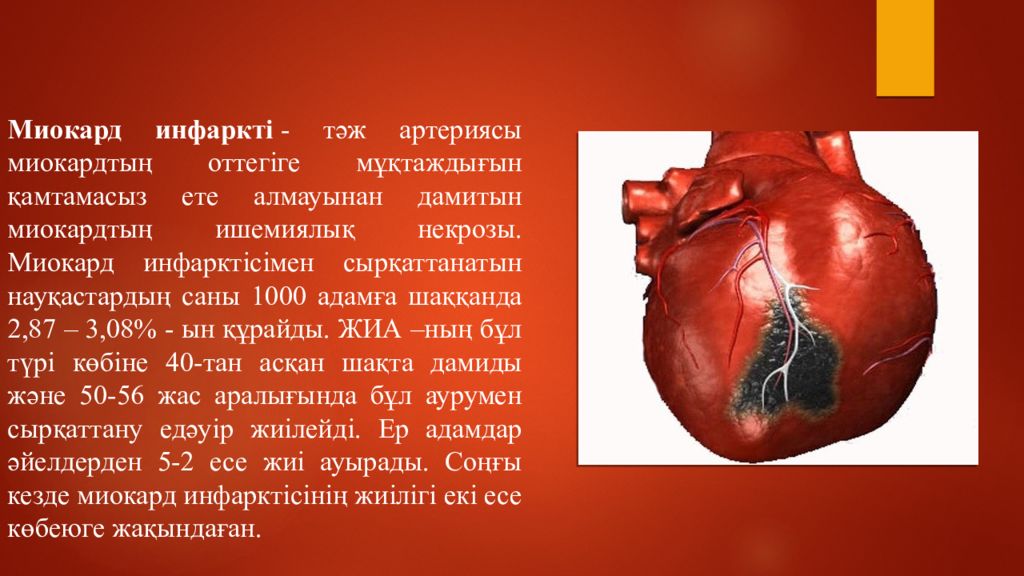 Миокард инфаркті - тәж артериясы миокардтың оттегіге мұқтаждығын қамтамасыз ете алмауынан дамитын миокардтың ишемиялық некрозы. Миокард инфарктісімен сырқаттанатын науқастардың саны 1000 адамға шаққанда 2,87 – 3,08% - ын құрайды. ЖИА –ның бұл түрі көбіне 40-тан асқан шақта дамиды және 50-56 жас аралығында бұл аурумен сырқаттану едәуір жиілейді. Ер адамдар әйелдерден 5-2 есе жиі ауырады. Соңғы кезде миокард инфарктісінің жиілігі екі есе көбеюге жақындаған.
