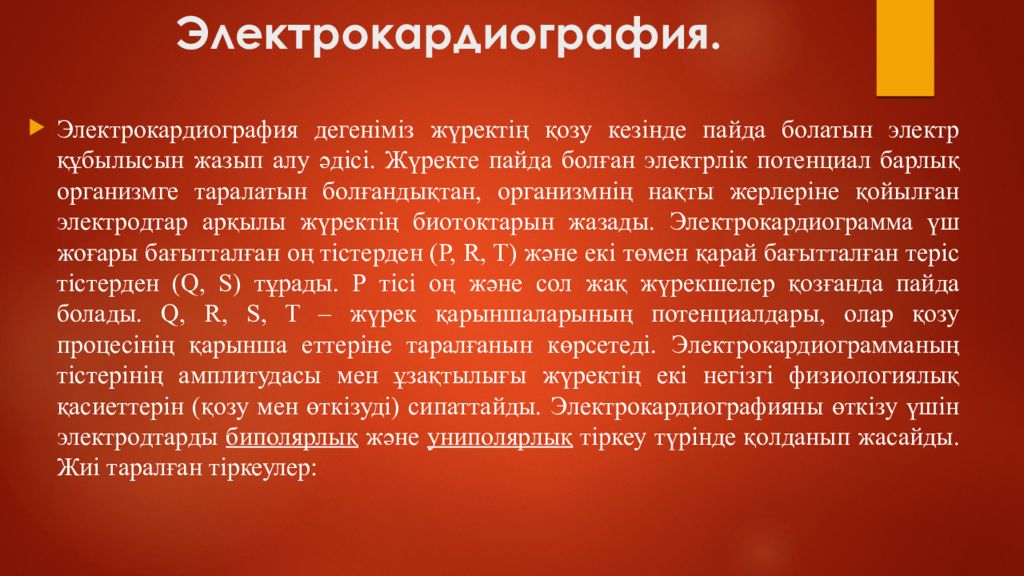 Электрокардиография дегеніміз жүректің қозу кезінде пайда болатын электр құбылысын жазып алу әдісі. Жүректе пайда болған электрлік потенциал барлық организмге таралатын болғандықтан, организмнің нақты жерлеріне қойылған электродтар арқылы жүректің биотоктарын жазады. Электрокардиограмма үш жоғары бағытталған оң тістерден (Р, R, T) және екі төмен қарай бағытталған теріс тістерден (Q, S) тұрады. Р тісі оң және сол жақ жүрекшелер қозғанда пайда болады. Q, R, S, T – жүрек қарыншаларының потенциалдары, олар қозу процесінің қарынша еттеріне таралғанын көрсетеді. Электрокардиограмманың тістерінің амплитудасы мен ұзақтылығы жүректің екі негізгі физиологиялық қасиеттерін (қозу мен өткізуді) сипаттайды. Электрокардиографияны өткізу үшін электродтарды биполярлық және униполярлық тіркеу түрінде қолданып жасайды. Жиі таралған тіркеулер: