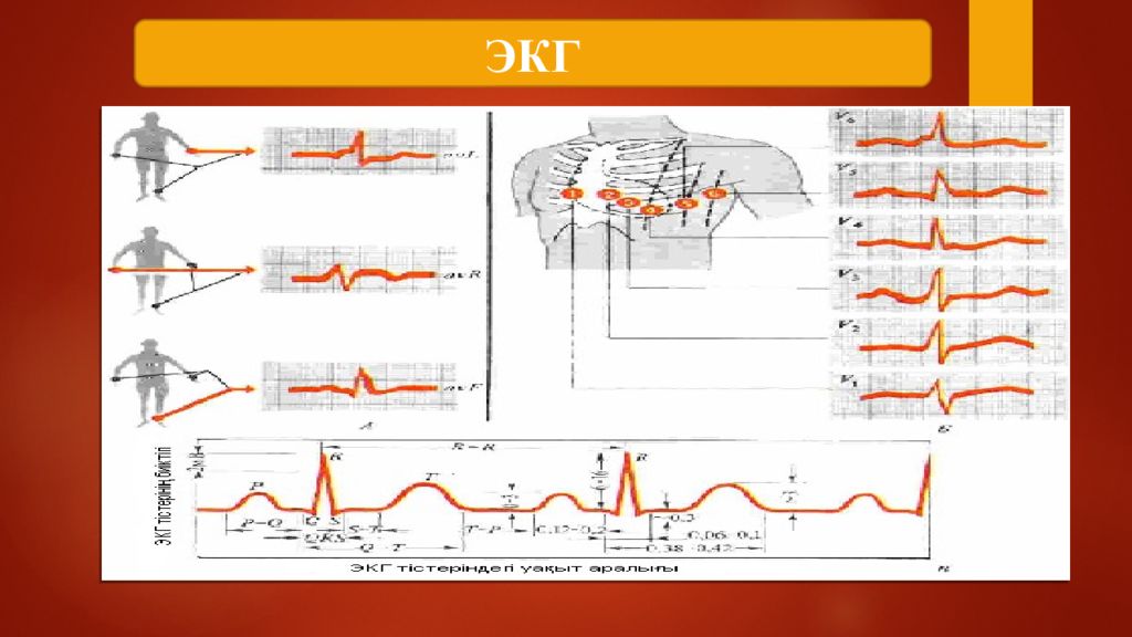 1) аяқ пен қолдардың арасындағы потенциалдар айырмашылығын үш стандартты биополярлық тіркеу арқылы жазады: I тіркеу – оң және сол қол, II тіркеу- оң қол және сол аяқ, III тіркеу – сол қол және сол аяқ. Оң аяққа индиференттік электрод бекітіледі; 2) жүрек тоғын – аяқ-қолдан үш униполярлық тіркеу арқылы жасауға болады. Аяқ-қолдағы активті электрод пен индиференттік электрод арасындағы потенциалдардың айырмашылығын жазады. Оң қолдан жазылатын ЭКГ-ма - аvR, сол қолдан - аvL, сол аяқтан - а vҒ әріптерімен белгіленеді; 3) жүрек маңынан ЭКГ-ма алты униполярлық тіркеу (Вильсон тіркеуі) арқылы жазылады. Мұндайда кеуде шеңберінде белгіленген нүктелердің потенциалы мен нольдік потенциалдың айырмашылығын жазып алады. Активті электрод V әріппен белгіленген алты нүктелерге орналастырады. V 1 нүкте – төртінші қабырға аралығында төстің оң шетінен 1 см оңға қарай жерде; V 2 - төртінші қабырға аралығында төстің сол шетінен 1 см солға қарай; V 3 – V 2 мен V 4 ортасында;V 4 - бесінші қабырға аралығында сол бұғананың ортаңғы сызығы тұсында; V 5 – бесінші қабырға аралығында алдыңғы аксиллярлық сызық тұсындаболады.