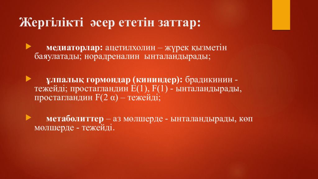 медиаторлар: ацетилхолин – жүрек қызметін баяулатады; норадреналин ынталандырады; ұлпалық гормондар (кининдер): брадикинин - тежейді; простагландин E(1), F(1) - ынталандырады, простагландин F(2 α ) – тежейді; метаболиттер – аз мөлшерде - ынталандырады, көп мөлшерде - тежейді.