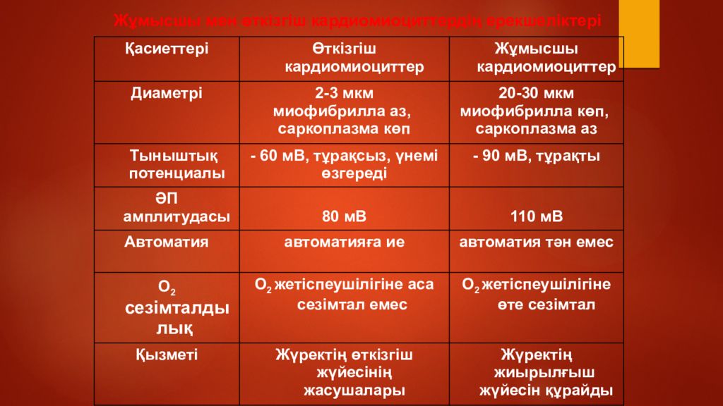 Қасиеттері Өткізгіш кардиомиоциттер Жұмысшы кардиомиоциттер Диаметрі 2-3 мкм миофибрилла аз, саркоплазма көп 20-30 мкм миофибрилла көп, саркоплазма аз Тыныштық потенциалы - 60 мВ, тұрақсыз, үнемі өзгереді - 90 мВ, тұрақты ӘП амплитудасы 80 мВ 110 мВ Автоматия автоматияға ие автоматия тән емес О 2 сезімталдылық О 2 жетіспеушілігіне аса сезімтал емес О 2 жетіспеушілігіне өте сезімтал Қызметі Жүректің өткізгіш жүйесінің жасушалары Жүректің жиырылғыш жүйесін құрайды Жұмысшы мен өткізгіш кардиомиоциттердің ерекшеліктері