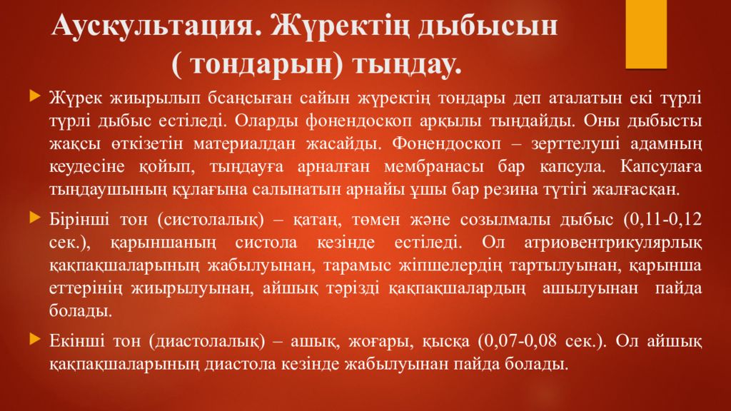 Слайд 40: Аускультация. Жүректің дыбысын ( тондарын) тыңдау