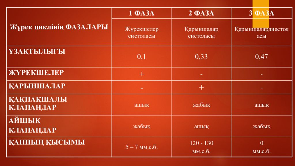 Жүрек циклінің ФАЗАЛАРЫ 1 ФАЗА 2 ФАЗА 3 ФАЗА Жүрекшелер систоласы Қарыншалар систоласы Қарыншалардиастоласы ҰЗАҚТЫЛЫҒЫ 0,1 0,33 0,47 ЖҮРЕКШЕЛЕР + - - ҚАРЫНШАЛАР - + - ҚАҚПАҚШАЛЫ КЛАПАНДАР ашық жабық ашық АЙШЫҚ КЛАПАНДАР жабық ашық жабық ҚАННЫҢ ҚЫСЫМЫ 5 – 7 мм.с.б. 120 - 130 мм.с.б. 0 мм.с.б.