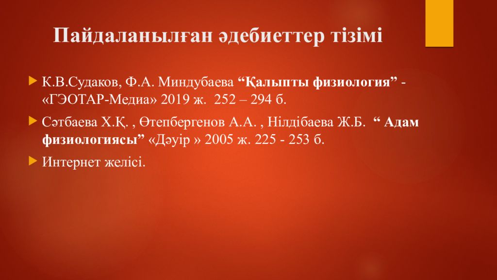 К.В.Судаков, Ф.А. Миндубаева “Қалыпты физиология” - « ГЭОТАР-Медиа » 2019 ж. 252 – 294 б. С әтбаева Х.Қ., Өтепбергенов А.А., Нілдібаева Ж.Б. “ Адам физиологиясы” « Дәуір » 2005 ж. 225 - 253 б. Интернет желісі.