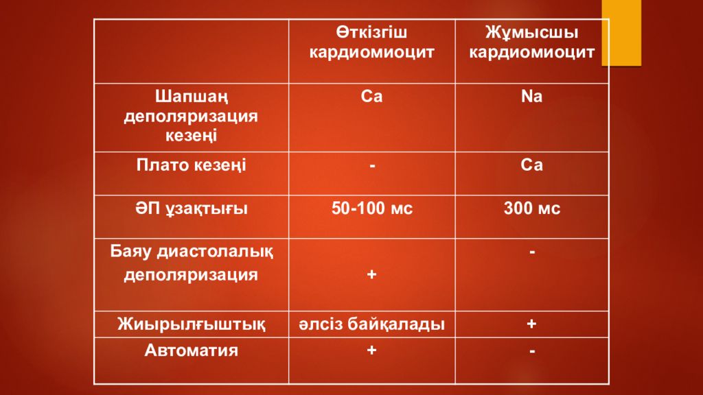 Өткізгіш кардиомиоцит Жұмысшы кардиомиоцит Шапшаң деполяризация кезеңі Ca Na Плато кезеңі - Са ӘП ұзақтығы 50-100 мс 300 мс Баяу диастолалық деполяризация + - Жиырылғыштық әлсіз байқалады + Автоматия + -