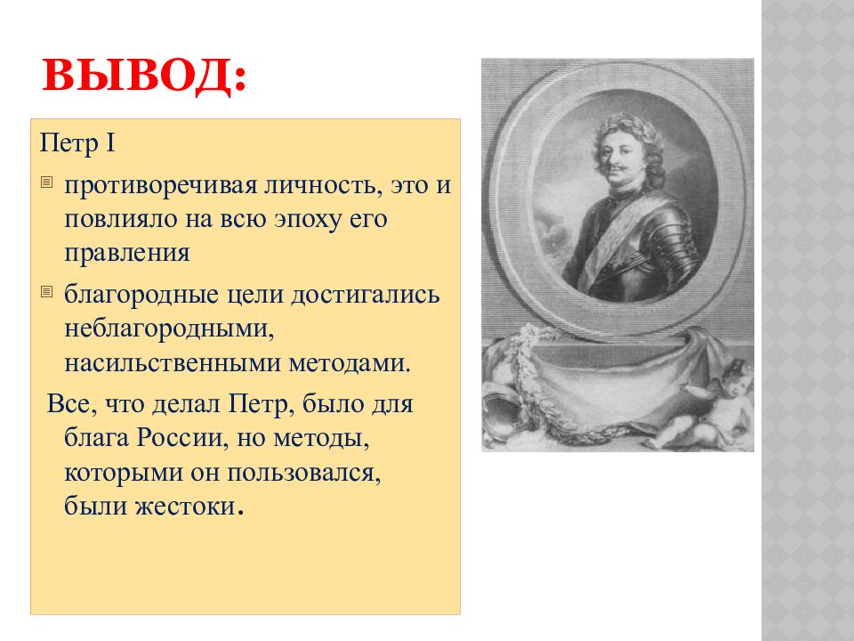 Петр I противоречивая личность, это и повлияло на всю эпоху его правления благородные цели достигались неблагородными, насильственными методами. Все, что делал Петр, было для блага России, но методы, которыми он пользовался, были жестоки.