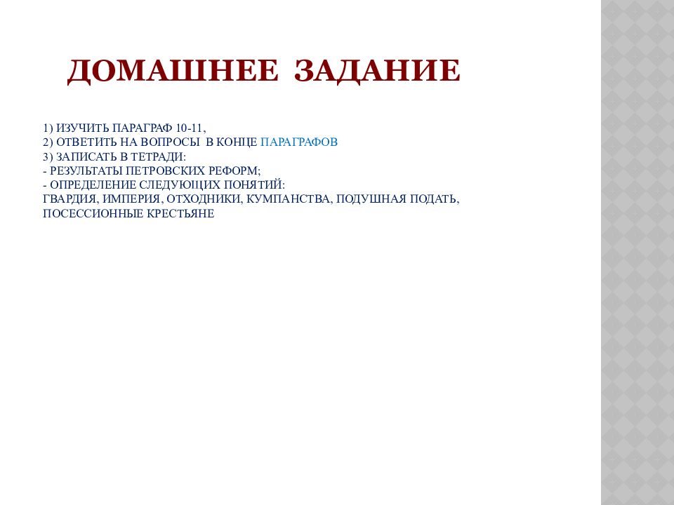 Последний слайд презентации: Значение петровских преобразований в истории страны Подготовила учитель истории: 1) Изучить параграф 10-11, 2) ответить на вопросы в конце параграфов 3) записать в тетради: - результаты петровских реформ; - определение следующих понятий: гвардия, империя, отходники, кумпанства, подушная подать, посессионные крестьяне
