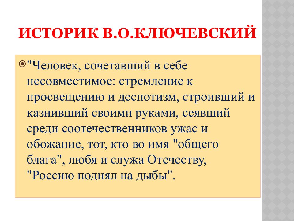 "Человек, сочетавший в себе несовместимое: стремление к просвещению и деспотизм, строивший и казнивший своими руками, сеявший среди соотечественников ужас и обожание, тот, кто во имя "общего блага", любя и служа Отечеству, "Россию поднял на дыбы".