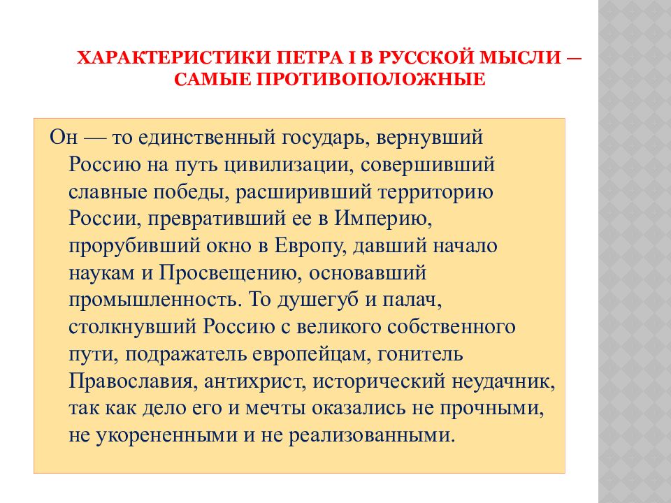 Он — то единственный государь, вернувший Россию на путь цивилизации, совершивший славные победы, расширивший территорию России, превративший ее в Империю, прорубивший окно в Европу, давший начало наукам и Просвещению, основавший промышленность. То душегуб и палач, столкнувший Россию с великого собственного пути, подражатель европейцам, гонитель Православия, антихрист, исторический неудачник, так как дело его и мечты оказались не прочными, не укорененными и не реализованными.