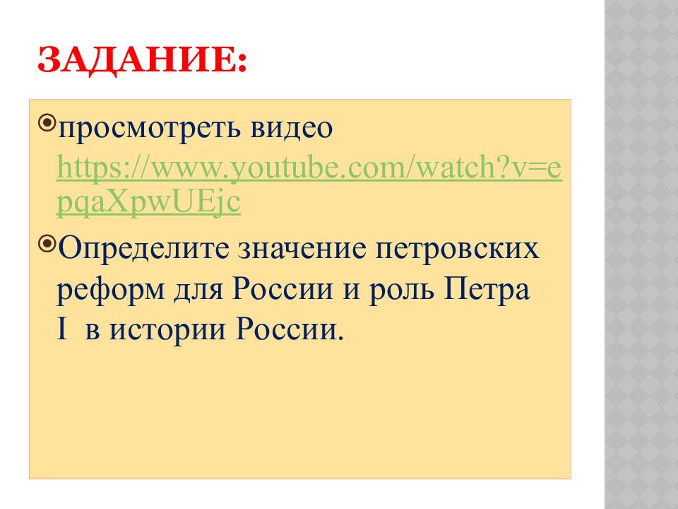 просмотреть видео https://www.youtube.com/watch?v=epqaXpwUEjc Определите значение петровских реформ для России и роль Петра I в истории России.