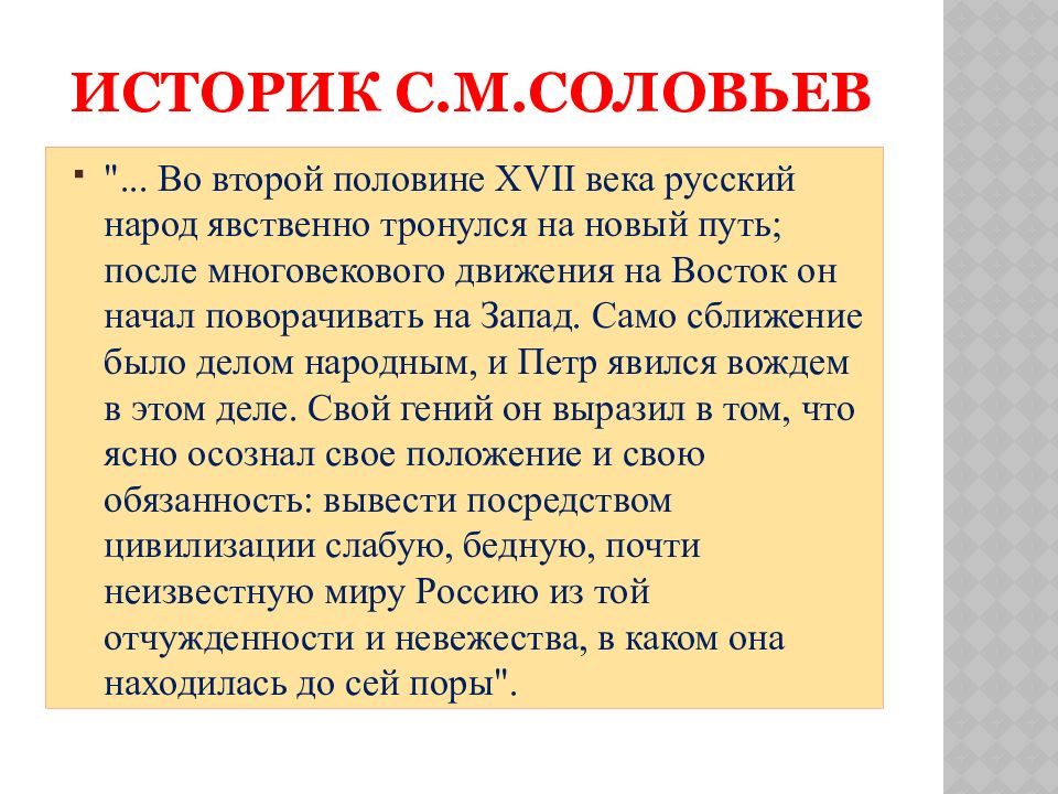 "... Во второй половине XVII века русский народ явственно тронулся на новый путь; после многовекового движения на Восток он начал поворачивать на Запад. Само сближение было делом народным, и Петр явился вождем в этом деле. Свой гений он выразил в том, что ясно осознал свое положение и свою обязанность: вывести посредством цивилизации слабую, бедную, почти неизвестную миру Россию из той отчужденности и невежества, в каком она находилась до сей поры".