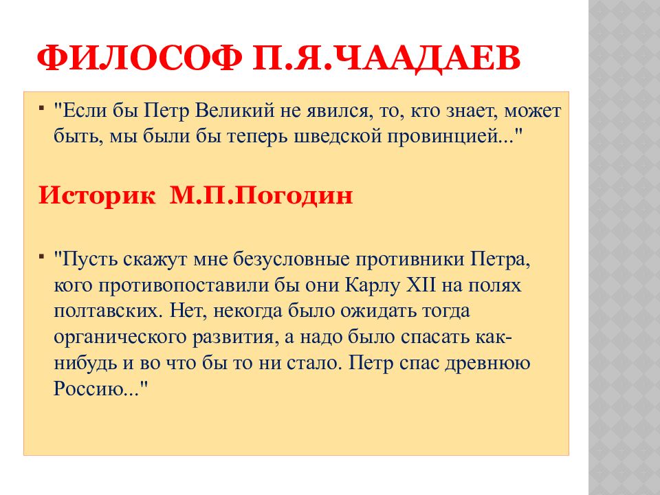 "Если бы Петр Великий не явился, то, кто знает, может быть, мы были бы теперь шведской провинцией..." Историк М.П.Погодин "Пусть скажут мне безусловные противники Петра, кого противопоставили бы они Карлу XII на полях полтавских. Нет, некогда было ожидать тогда органического развития, а надо было спасать как-нибудь и во что бы то ни стало. Петр спас древнюю Россию..."