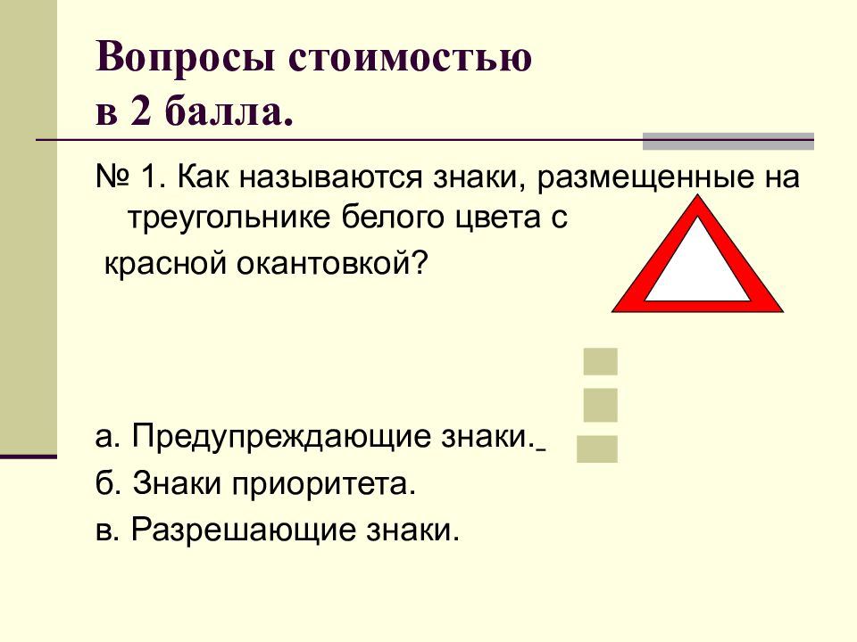 № 1. Как называются знаки, размещенные на треугольнике белого цвета с красной окантовкой? а. Предупреждающие знаки. б. Знаки приоритета. в. Разрешающие знаки.