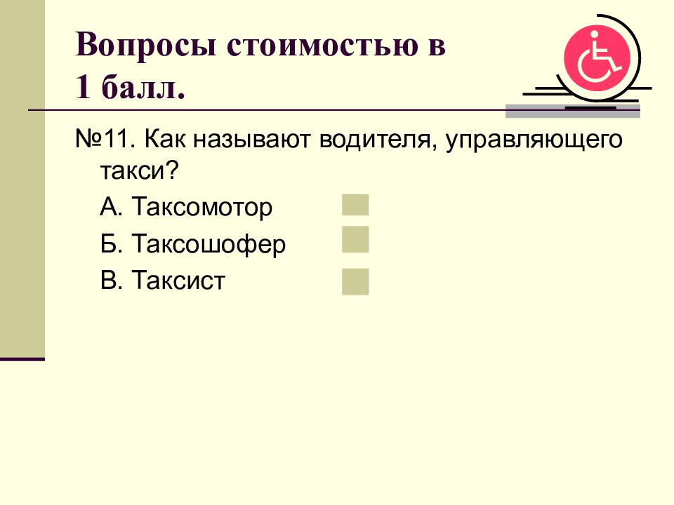 №11. Как называют водителя, управляющего такси? А. Таксомотор Б. Таксошофер В. Таксист