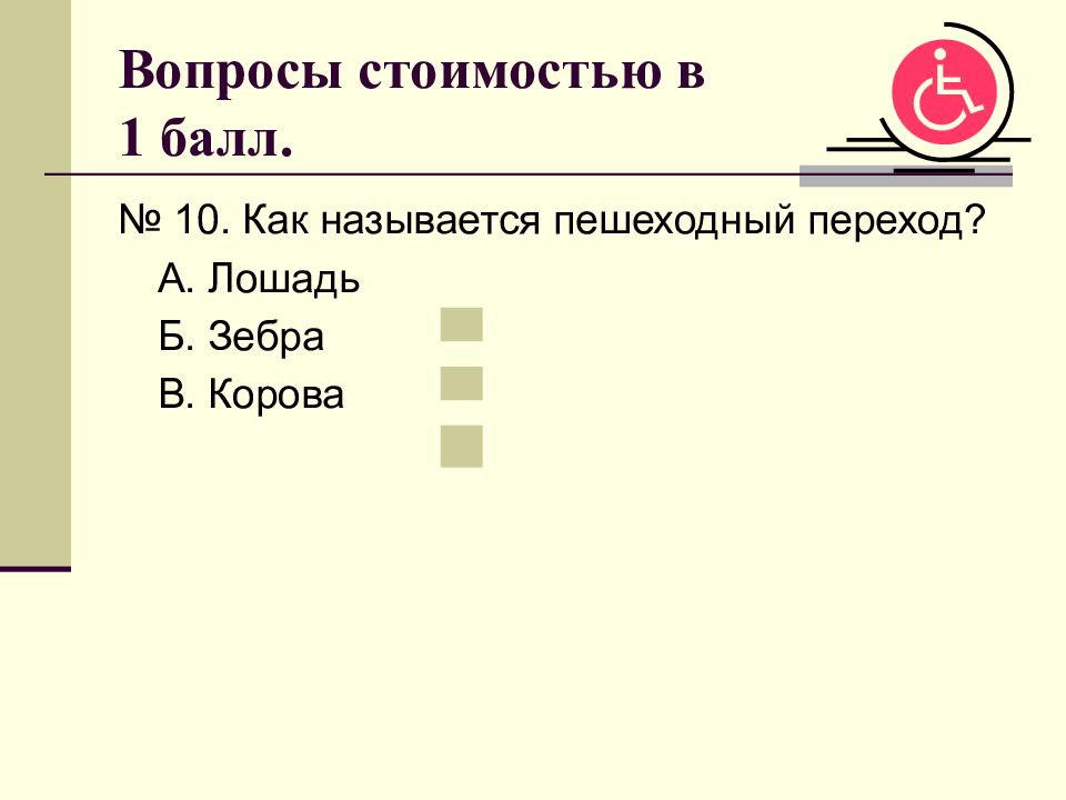№ 10. Как называется пешеходный переход? А. Лошадь Б. Зебра В. Корова