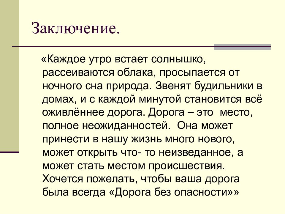 «Каждое утро встает солнышко, рассеиваются облака, просыпается от ночного сна природа. Звенят будильники в домах, и с каждой минутой становится всё оживлённее дорога. Дорога – это место, полное неожиданностей. Она может принести в нашу жизнь много нового, может открыть что- то неизведанное, а может стать местом происшествия. Хочется пожелать, чтобы ваша дорога была всегда «Дорога без опасности»»