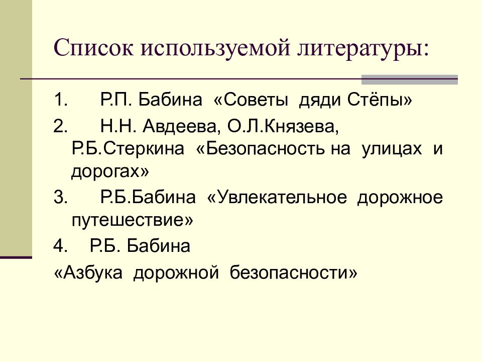 1. Р.П. Бабина «Советы дяди Стёпы» 2. Н.Н. Авдеева, О.Л.Князева, Р.Б.Стеркина «Безопасность на улицах и дорогах» 3. Р.Б.Бабина «Увлекательное дорожное путешествие» 4. Р.Б. Бабина «Азбука дорожной безопасности»