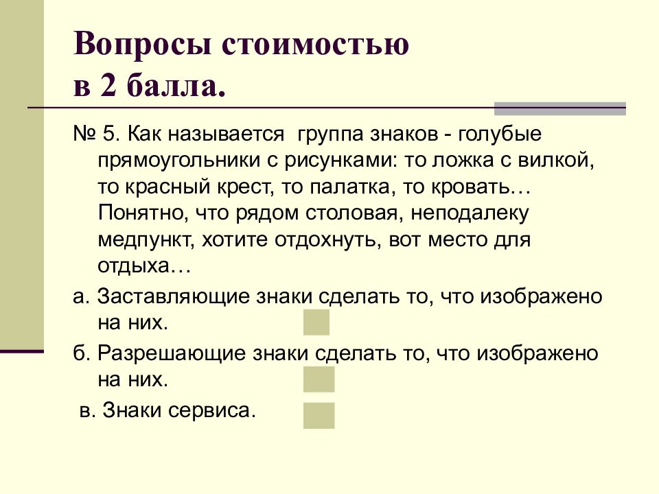 № 5. Как называется группа знаков - голубые прямоугольники с рисунками: то ложка с вилкой, то красный крест, то палатка, то кровать… Понятно, что рядом столовая, неподалеку медпункт, хотите отдохнуть, вот место для отдыха… а. Заставляющие знаки сделать то, что изображено на них. б. Разрешающие знаки сделать то, что изображено на них. в. Знаки сервиса.