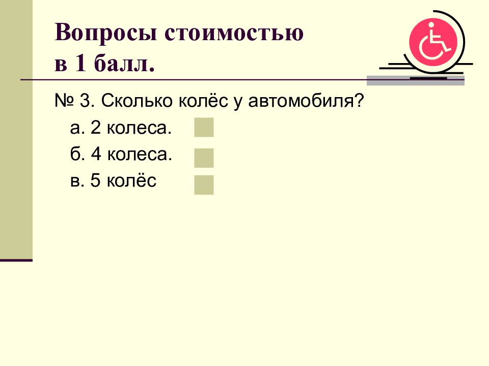 № 3. Сколько колёс у автомобиля? а. 2 колеса. б. 4 колеса. в. 5 колёс