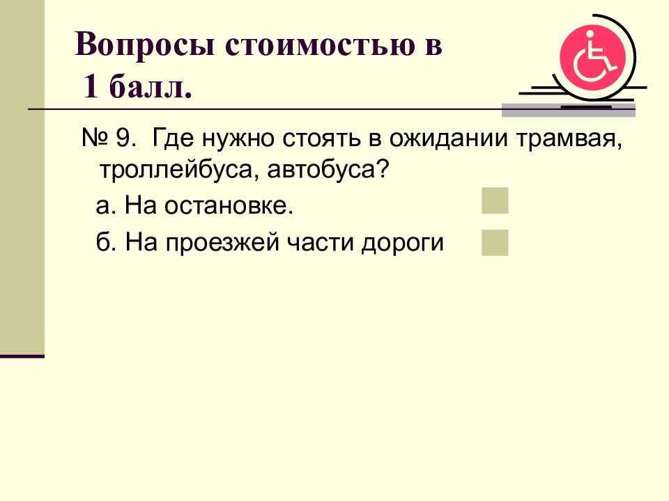 № 9. Где нужно стоять в ожидании трамвая, троллейбуса, автобуса? а. На остановке. б. На проезжей части дороги