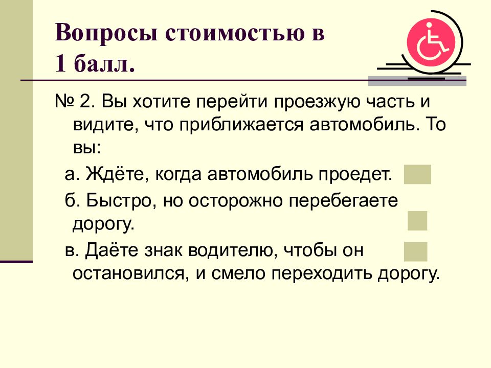 № 2. Вы хотите перейти проезжую часть и видите, что приближается автомобиль. То вы: а. Ждёте, когда автомобиль проедет. б. Быстро, но осторожно перебегаете дорогу. в. Даёте знак водителю, чтобы он остановился, и смело переходить дорогу.