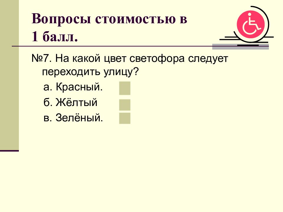 №7. На какой цвет светофора следует переходить улицу? а. Красный. б. Жёлтый в. Зелёный.