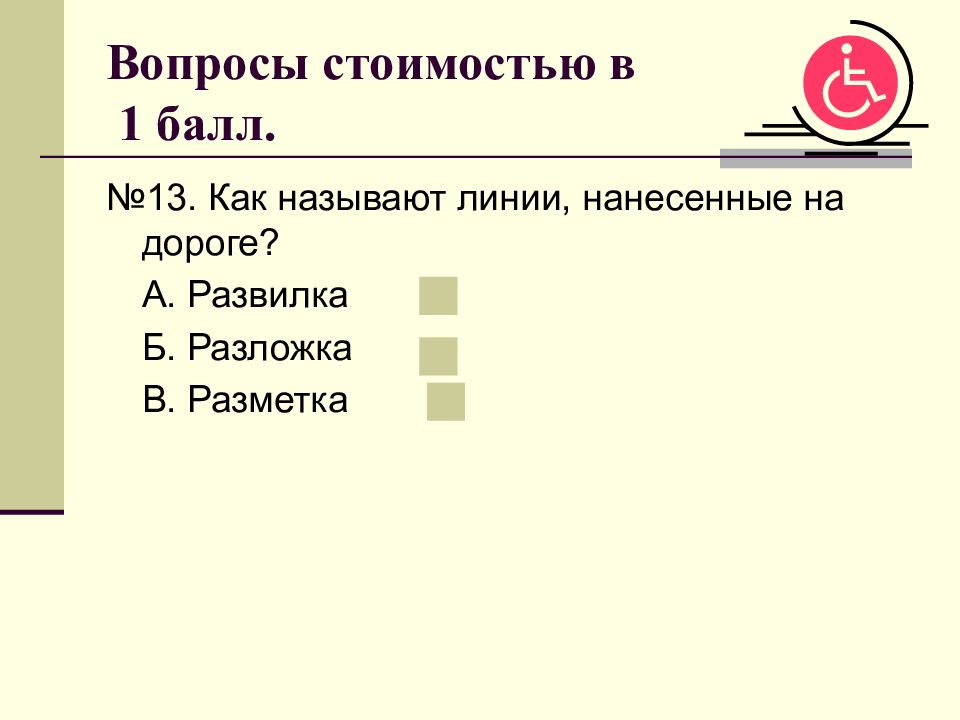 №13. Как называют линии, нанесенные на дороге? А. Развилка Б. Разложка В. Разметка