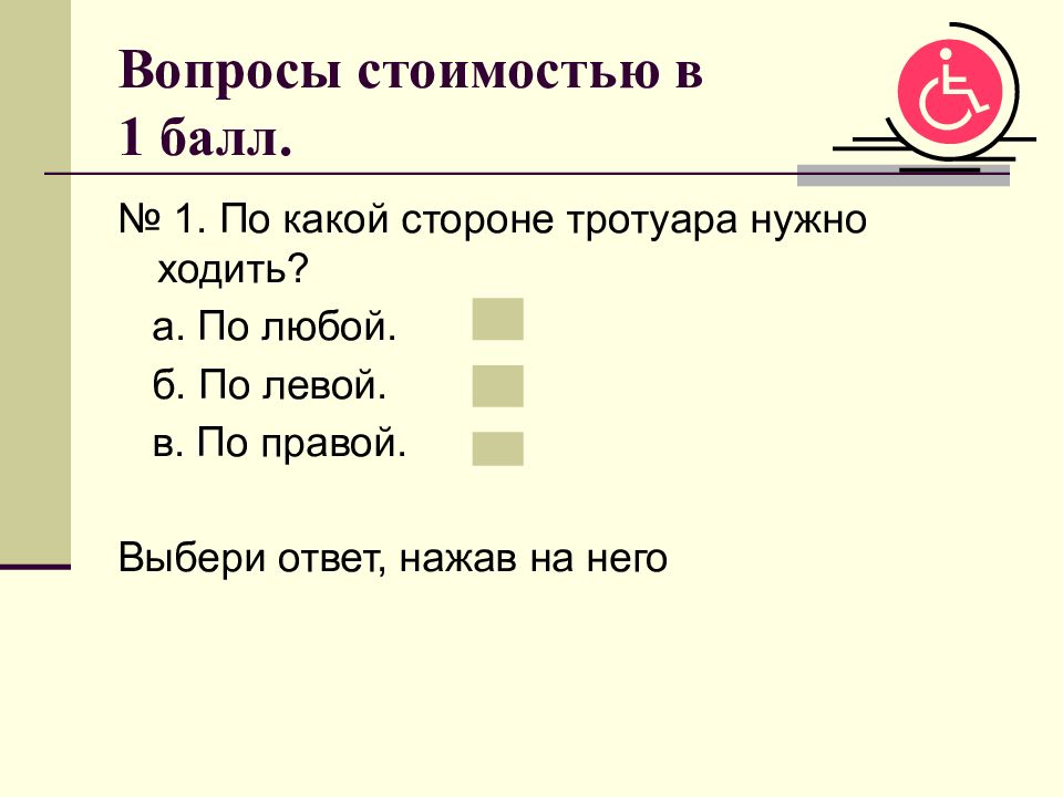 № 1. По какой стороне тротуара нужно ходить? а. По любой. б. По левой. в. По правой. Выбери ответ, нажав на него