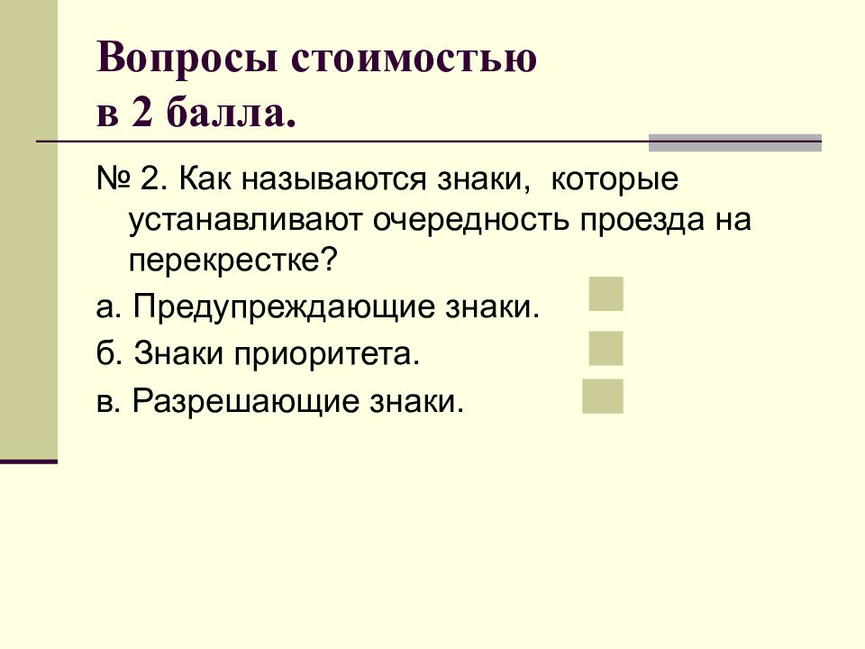 № 2. Как называются знаки, которые устанавливают очередность проезда на перекрестке? а. Предупреждающие знаки. б. Знаки приоритета. в. Разрешающие знаки.