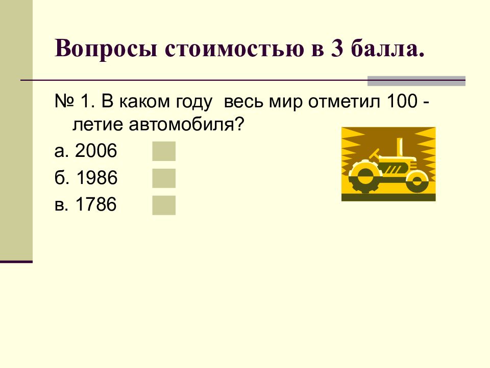 № 1. В каком году весь мир отметил 100 - летие автомобиля? а. 2006 б. 1986 в. 1786