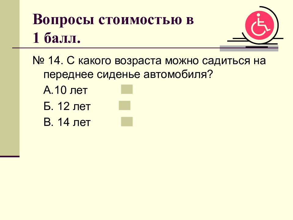 № 14. С какого возраста можно садиться на переднее сиденье автомобиля? А.10 лет Б. 12 лет В. 14 лет