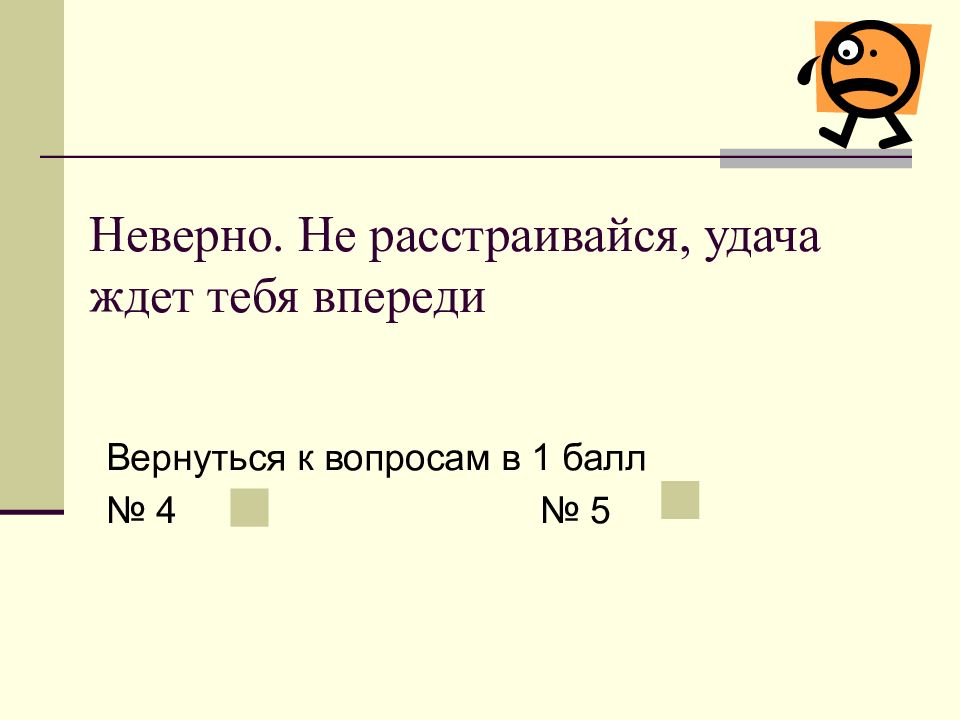 Слайд 4: Неверно. Не расстраивайся, удача ждет тебя впереди
