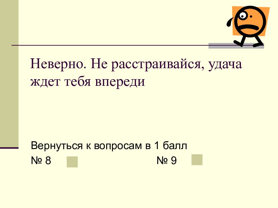 Слайд 10: Неверно. Не расстраивайся, удача ждет тебя впереди