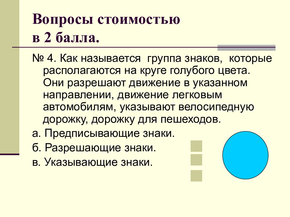 № 4. Как называется группа знаков, которые располагаются на круге голубого цвета. Они разрешают движение в указанном направлении, движение легковым автомобилям, указывают велосипедную дорожку, дорожку для пешеходов. а. Предписывающие знаки. б. Разрешающие знаки. в. Указывающие знаки.