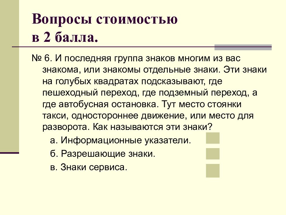 № 6. И последняя группа знаков многим из вас знакома, или знакомы отдельные знаки. Эти знаки на голубых квадратах подсказывают, где пешеходный переход, где подземный переход, а где автобусная остановка. Тут место стоянки такси, одностороннее движение, или место для разворота. Как называются эти знаки? а. Информационные указатели. б. Разрешающие знаки. в. Знаки сервиса.