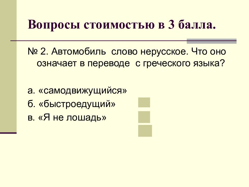№ 2. Автомобиль слово нерусское. Что оно означает в переводе с греческого языка? а. «самодвижущийся» б. «быстроедущий» в. «Я не лошадь»