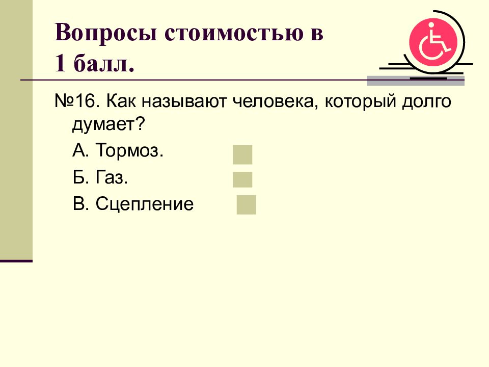 №16. Как называют человека, который долго думает? А. Тормоз. Б. Газ. В. Сцепление