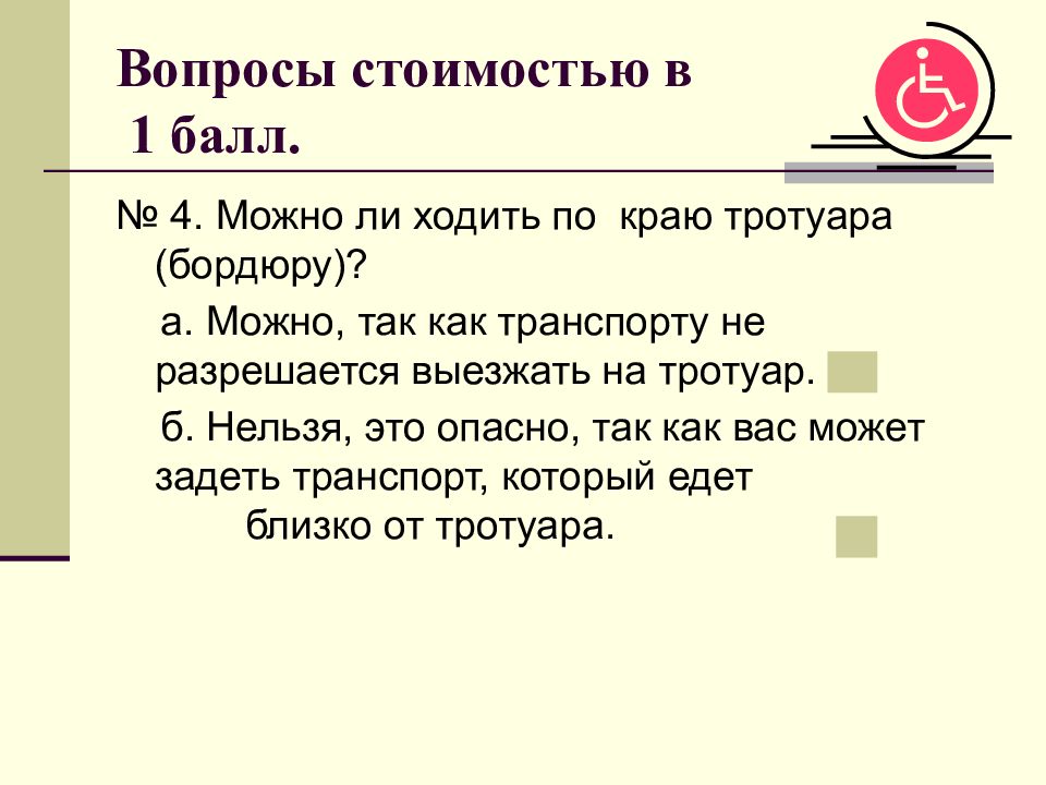 № 4. Можно ли ходить по краю тротуара (бордюру)? а. Можно, так как транспорту не разрешается выезжать на тротуар. б. Нельзя, это опасно, так как вас может задеть транспорт, который едет близко от тротуара.