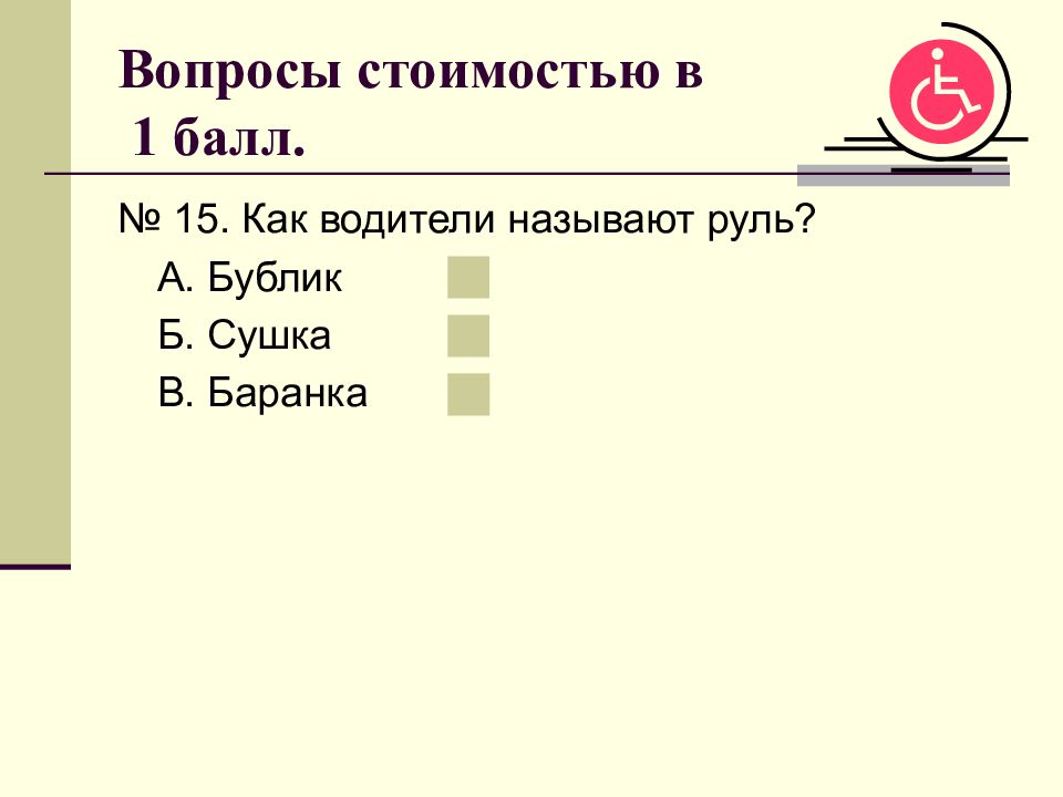 № 15. Как водители называют руль? А. Бублик Б. Сушка В. Баранка