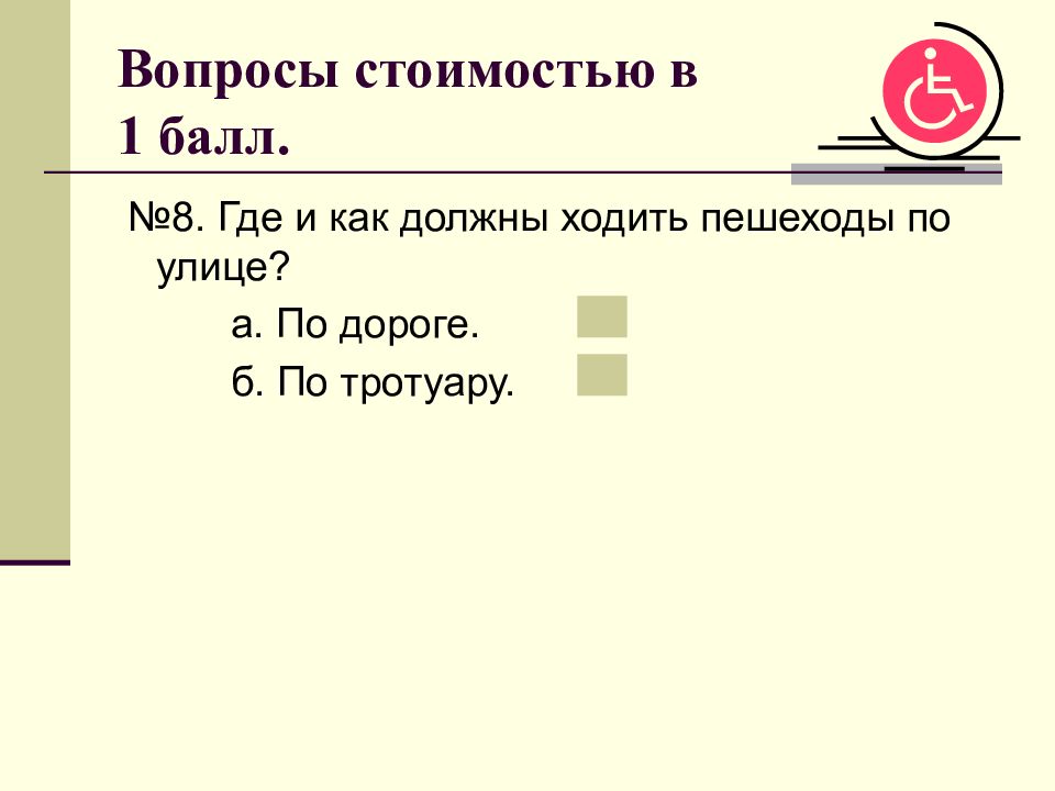 №8. Где и как должны ходить пешеходы по улице? а. По дороге. б. По тротуару.