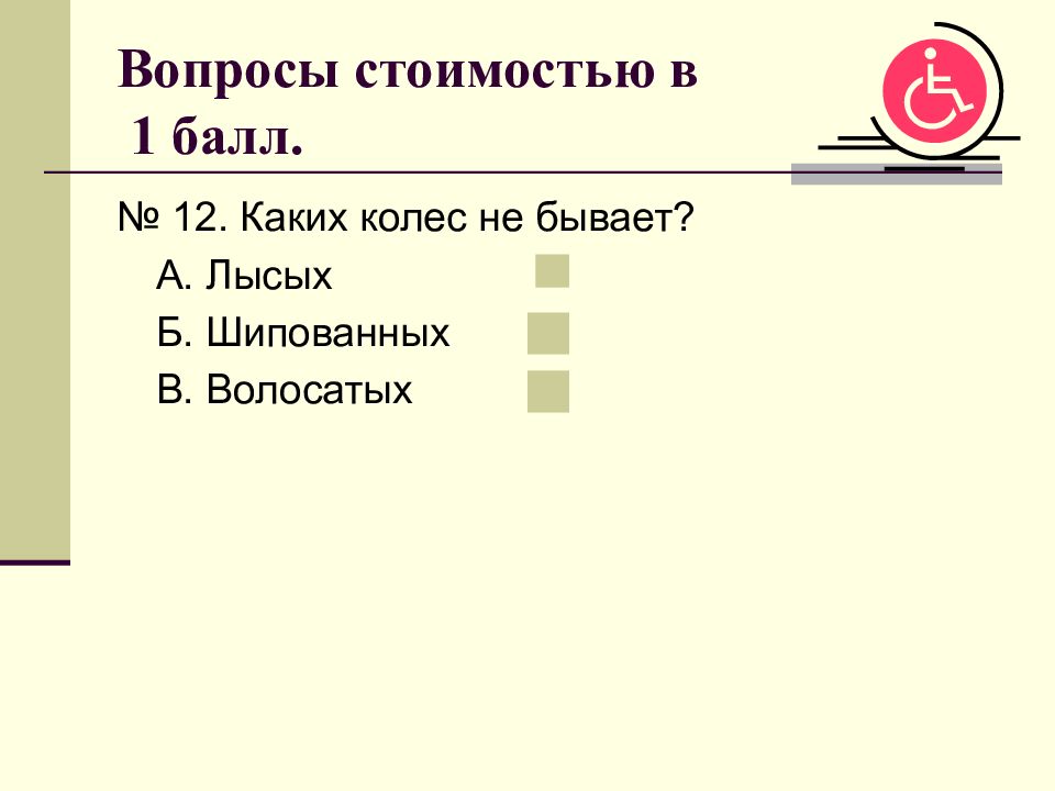 № 12. Каких колес не бывает? А. Лысых Б. Шипованных В. Волосатых