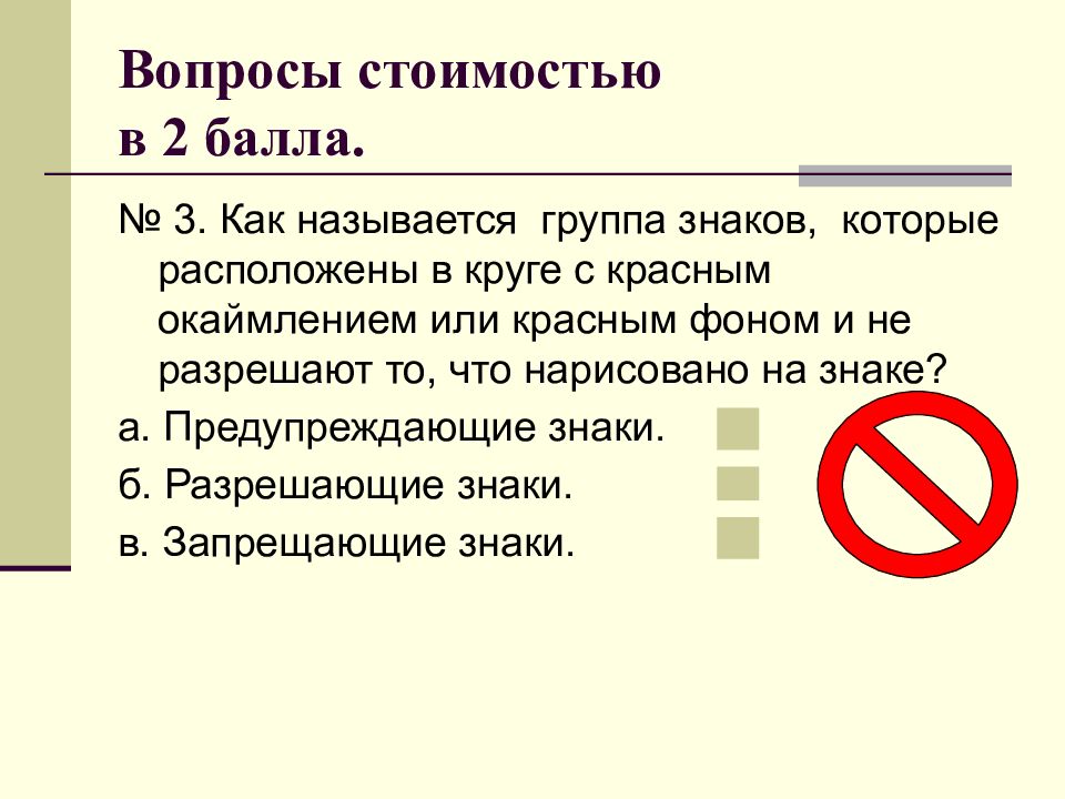 № 3. Как называется группа знаков, которые расположены в круге с красным окаймлением или красным фоном и не разрешают то, что нарисовано на знаке? а. Предупреждающие знаки. б. Разрешающие знаки. в. Запрещающие знаки.