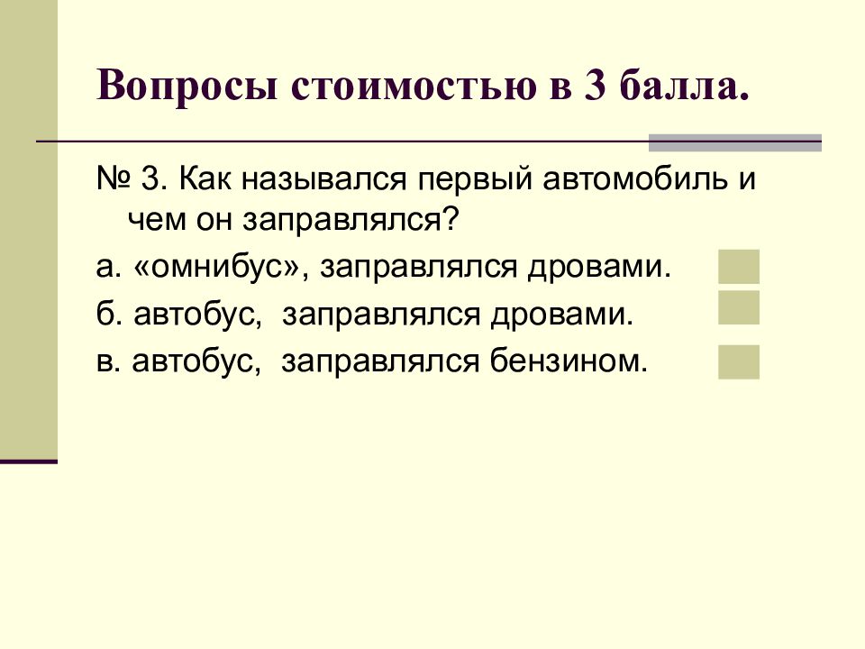 № 3. Как назывался первый автомобиль и чем он заправлялся? а. «омнибус», заправлялся дровами. б. автобус, заправлялся дровами. в. автобус, заправлялся бензином.