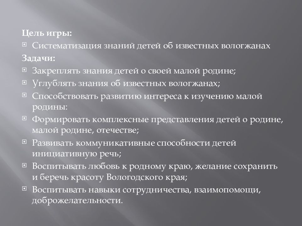 Цель игры: Систематизация знаний детей об известных вологжанах Задачи: Закреплять знания детей о своей малой родине; Углублять знания об известных вологжанах; Способствовать развитию интереса к изучению малой родины: Формировать комплексные представления детей о родине, малой родине, отечестве; Развивать коммуникативные способности детей инициативную речь; Воспитывать любовь к родному краю, желание сохранить и беречь красоту Вологодского края; Воспитывать навыки сотрудничества, взаимопомощи, доброжелательности.