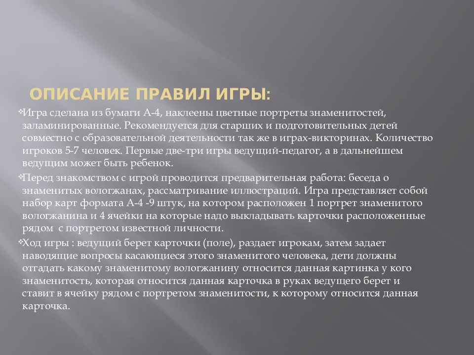 Игра сделана из бумаги А-4, наклеены цветные портреты знаменитостей, заламинированные. Рекомендуется для старших и подготовительных детей совместно с образовательной деятельности так же в играх-викторинах. Количество игроков 5-7 человек. Первые две-три игры ведущий-педагог, а в дальнейшем ведущим может быть ребенок. Перед знакомством с игрой проводится предварительная работа: беседа о знаменитых вологжанах, рассматривание иллюстраций. Игра представляет собой набор карт формата А-4 -9 штук, на котором расположен 1 портрет знаменитого вологжанина и 4 ячейки на которые надо выкладывать карточки расположенные рядом с портретом известной личности. Ход игры : ведущий берет карточки (поле), раздает игрокам, затем задает наводящие вопросы касающиеся этого знаменитого человека, дети должны отгадать какому знаменитому вологжанину относится данная картинка у кого знаменитость, которая относится данная карточка в руках ведущего берет и ставит в ячейку рядом с портретом знаменитости, к которому относится данная карточка.
