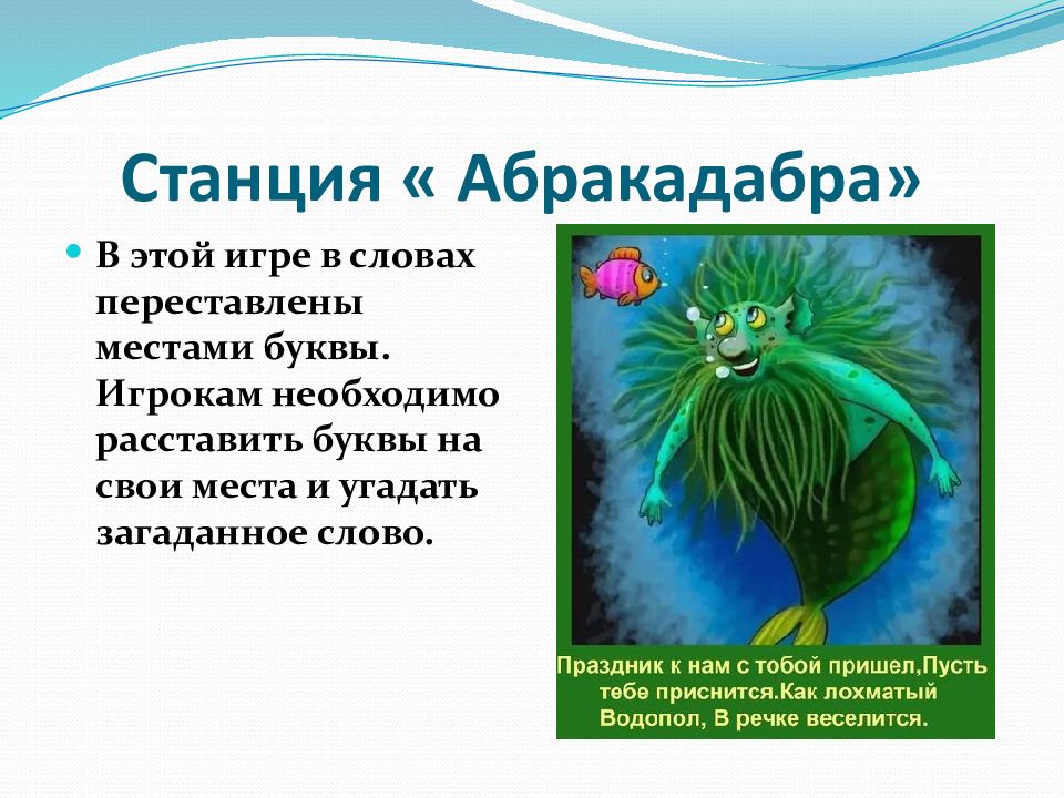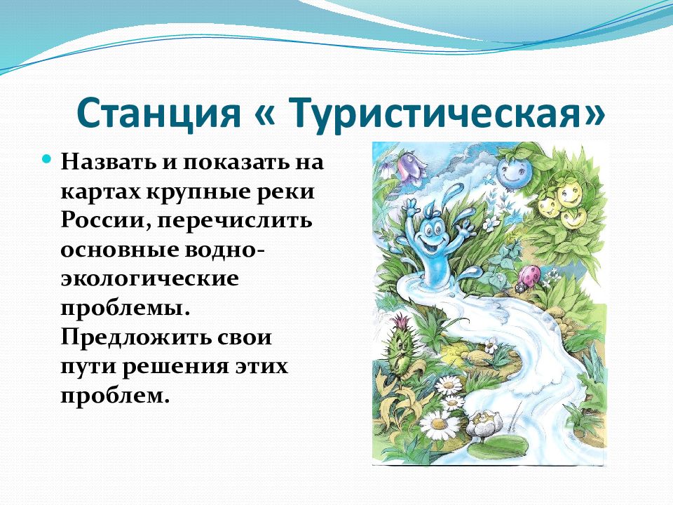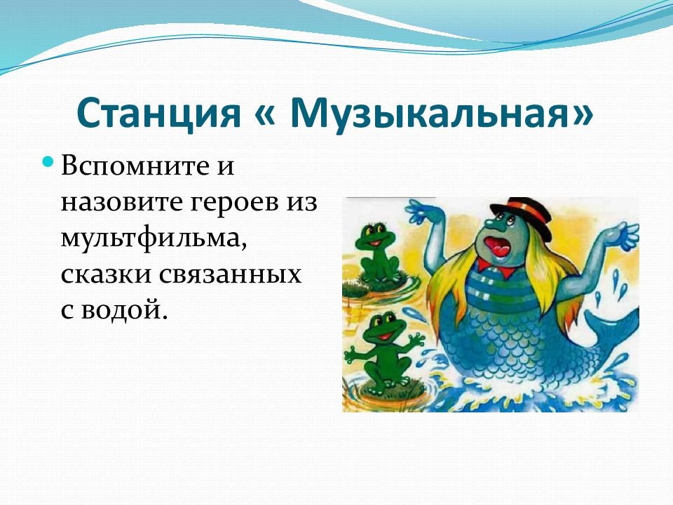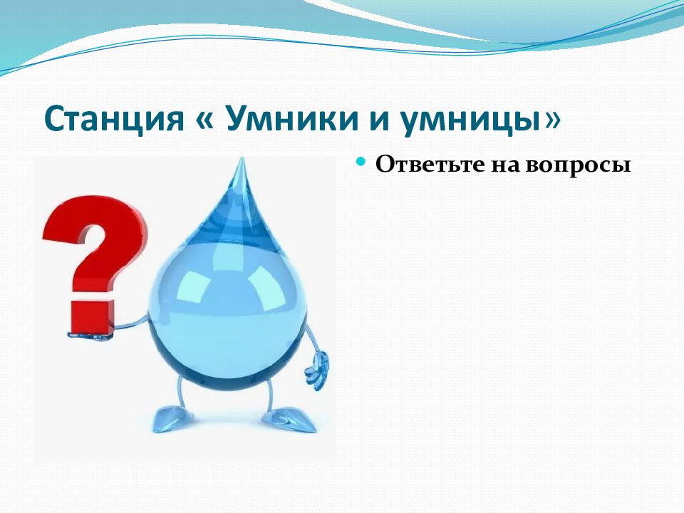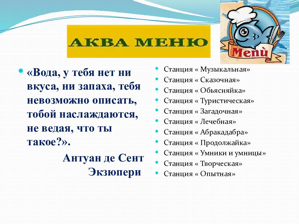 «Вода, у тебя нет ни вкуса, ни запаха, тебя невозможно описать, тобой наслаждаются, не ведая, что ты такое ?». Антуан де Сент Экзюпери Станция « Музыкальная» Станция « Сказочная» Станция « О бьясняйка » Станция « Туристическая» Станция « Загадочная» Станция « Лечебная» Станция « Абракадабра» Станция « Продолжайка » Станция « Умники и умницы» Станция « Творческая» Станция « Опытная»