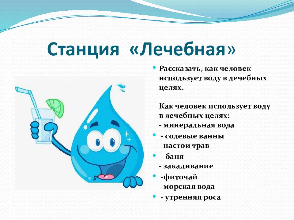 Рассказать, как человек использует воду в лечебных целях. Как человек использует воду в лечебных целях: - минеральная вода - солевые ванны - настои трав - баня - закаливание - фиточай - морская вода - утренняя роса