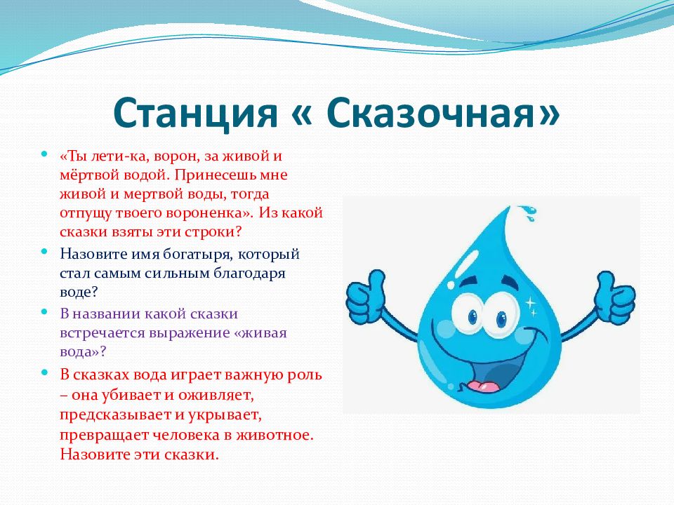 «Ты лети-ка, ворон, за живой и мёртвой водой. Принесешь мне живой и мертвой воды, тогда отпущу твоего вороненка». Из какой сказки взяты эти строки? Назовите имя богатыря, который стал самым сильным благодаря воде? В названии какой сказки встречается выражение «живая вода»? В сказках вода играет важную роль – она убивает и оживляет, предсказывает и укрывает, превращает человека в животное. Назовите эти сказки.