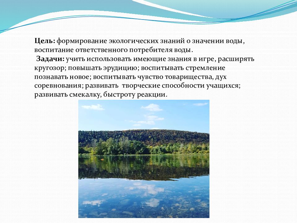 Цель: формирование экологических знаний о значении воды, воспитание ответственного потребителя воды. Задачи: учить использовать имеющие знания в игре, расширять кругозор; повышать эрудицию; воспитывать стремление познавать новое; воспитывать чувство товарищества, дух соревнования; развивать творческие способности учащихся; развивать смекалку, быстроту реакции.