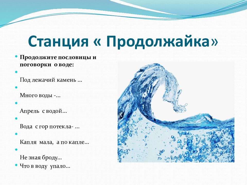 Продолжите пословицы и поговорки о воде: Под лежачий камень … Много воды -… Апрель с водой… Вода с гор потекла- … Капля мала, а по капле … Не зная броду… Что в воду упало…